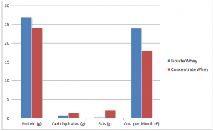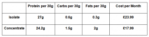 Below is a macros vs cost comparison of concentrate whey and isolate whey from a major supplement company*.